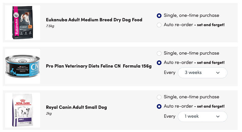 Find the product you want to purchase, select “Auto re-order - set and forget!”, choose your timeframe and select "add to cart".